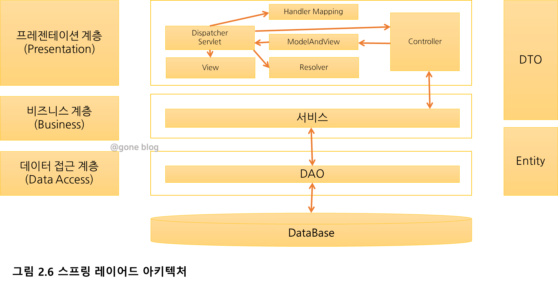 | 일반적인 레이어드 아키텍처 | 스프링 레이어드 아키텍처 | |